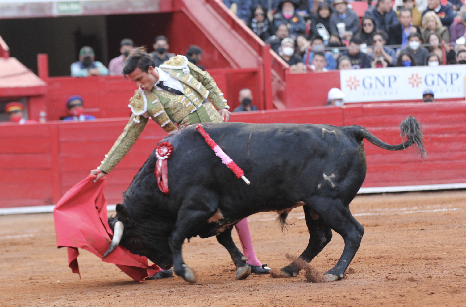Arrollado, al quedar al descubierto, pero el cierraplaza desconoce capotes y asistencias; su objetivo es el novillero y, justo cuando lo incorporan viene el segundo gañafonazo. Y rumbo a la enfermería se les escapa. Así, a base de arrojo planta cara al peligro aliñando. Hunde la espada por derecho y viene la confusión.