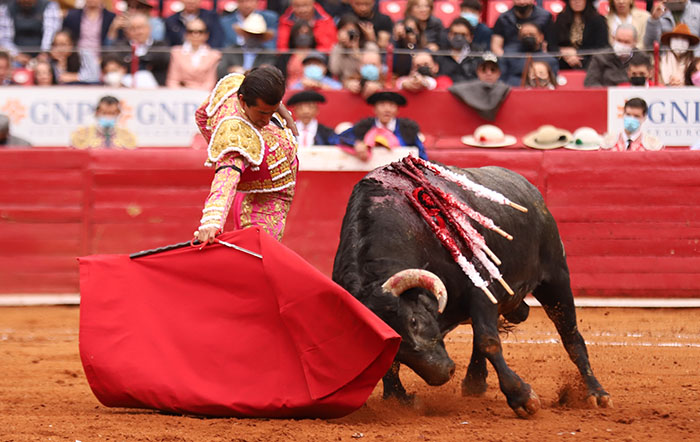 Así logró paulatinamente sobando hasta encelar tras cuatro series alternadas; el fondo lo extrajo en la parte final con una Trincherilla por dentro haciéndolo Romper en dos derechazos y uno de vuelta entera. “No hay toro, pero hay torero” se escuchó desde el tendido. Y en un palmo de terreno se ha recreado toreando en torno a su cuerpo. Sello propio al matar envainando en el sitio. Oreja.